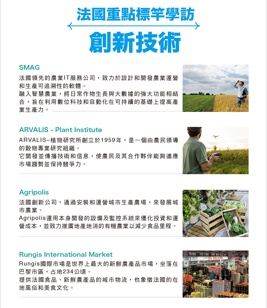 「2019年法國農業考察團」已開始報名,本團由行政院農業委員會委託中國生產力中心辦理,將帶領團員前往自然氣候條件優越的歐盟農業生產大國–法國,參訪導入創新技術之農企業與研發機構,學習各產業之現代經營,以及如何透過資源與數據共享,共同提升生產品質與產量,促進產業升級!