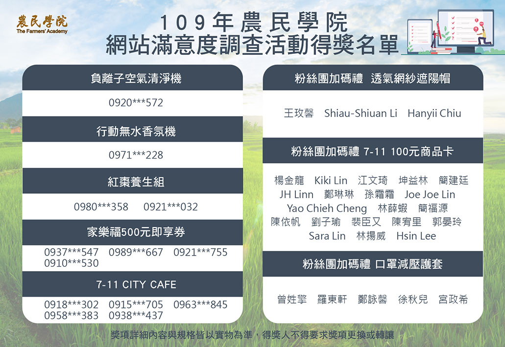 「109年農民學院網站滿意度調查活動」得獎名單出爐嘍!感謝大家對農民學院網的支持與愛護,各獎項得主已由電腦隨機抽出,得獎者將陸續以E-mail通知,請得獎者回覆正式E-mail給主辦單位以利核對,如得獎者不同意提供資料或填寫相關文件視為自動棄權,將不具中獎資格。獎項將於主辦單位收到得獎者資料,並確認無誤後10天內寄出。獎項詳細內容與規格皆以實物為準,得獎人不得要求獎項更換或轉讓。