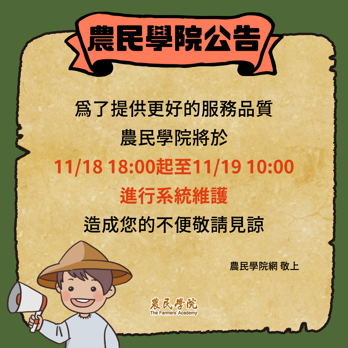 [臺北市]農民學院維護公告