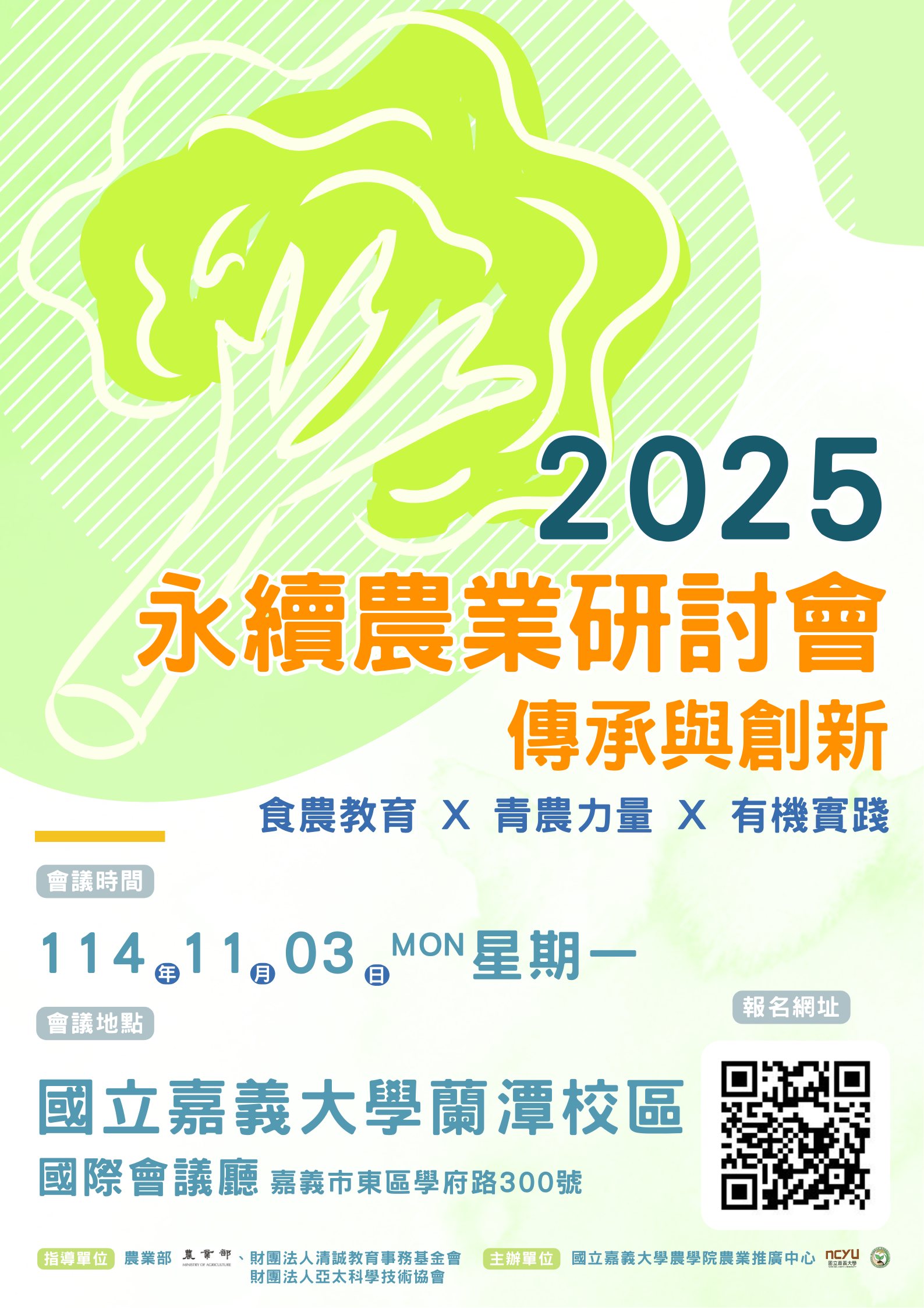 國立嘉義大學謹訂於114年11月3日(星期一)辦理「2025永續農業研討會-傳承與創新(食農教育 × 青農力量 × 有機實踐)」,敬邀蒞臨參加
